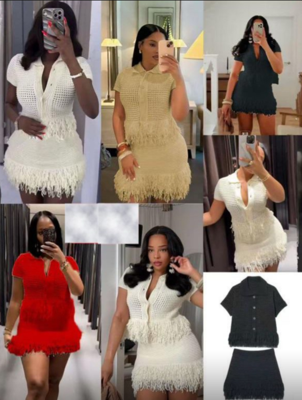 Elevate your style with this chic two-piece crochet set featuring a collared crop top and matching mini skirt, both adorned with playful fringe trim. The intricate crochet knit pattern creates a beautiful textured look, while the fringe detailing adds movement and bohemian flair. The crop top features a classic collar and button-front design, perfectly paired with the coordinating mini skirt. Available in versatile colors including Cream, Beige, Red, and Black, this set is perfect for festivals, beach outings, parties, or creating a standout casual look.